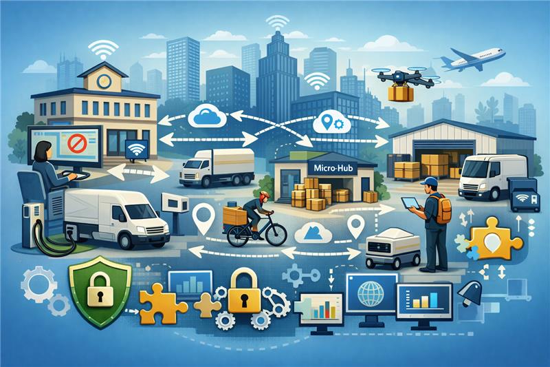 • Operators share operational data with cities, supporting adaptive urban planning decisions such as the location of logistics spaces (loading and unloading zones, micro-hubs), integration with other land uses, deployment of electric charging infrastructure, multimodal coordination and traffic management.