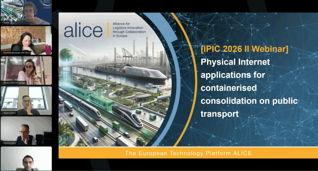 ALICE, together with KEDGE Business School and IMT Mines Albi, organised the second webinar in the IPIC 2026 series on “Physical Internet applications for containerised consolidation on public transport.” The session brought together stakeholders to explore how Physical Internet (PI) principles can support more efficient and sustainable logistics by integrating freight flows into public transport systems, with a focus on both urban and rural contexts.