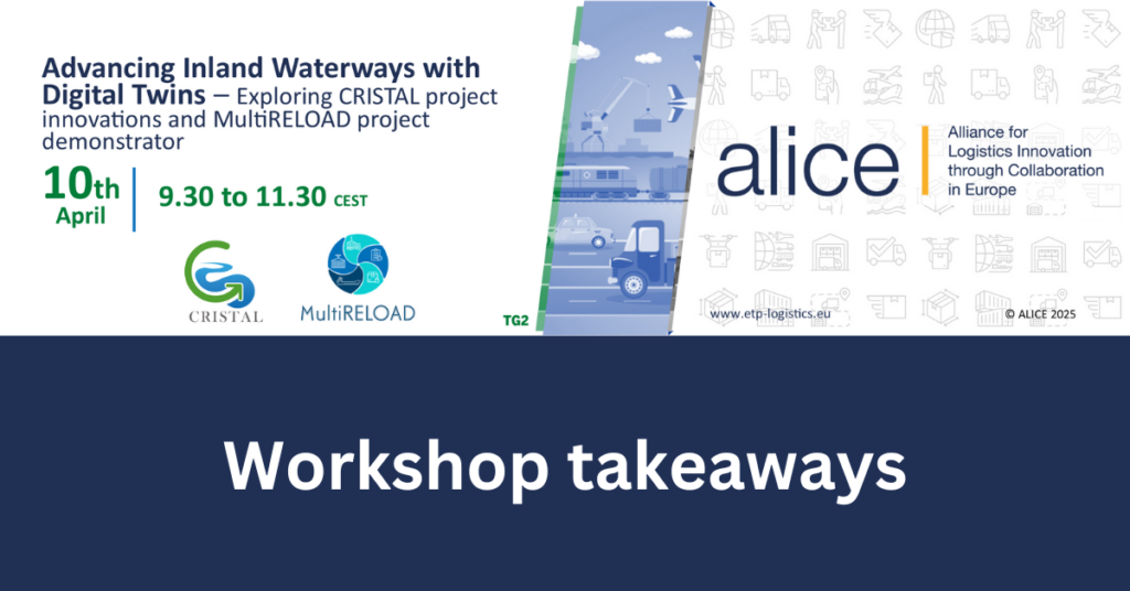 On 10 April 2025, ALICE hosted a well-attended and highly interactive workshop “Advancing Inland Waterways with Digital Twins – Exploring CRISTAL project innovations and MultiRELOAD project demonstrator.” The event brought together over 50 participants from across Europe, reflecting growing interest in the role of Digital Twins in enhancing inland waterway transport (IWT).